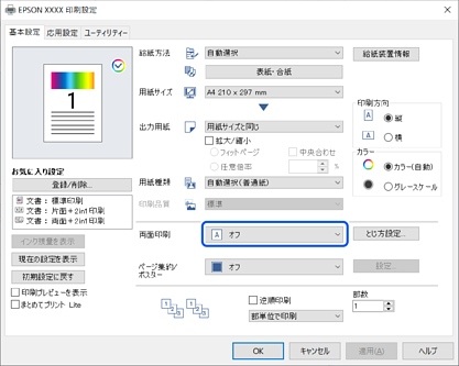 プリンタードライバーの画面を表示して、[基本設定]タブの[両面印刷]から[オフ]を選択します。
