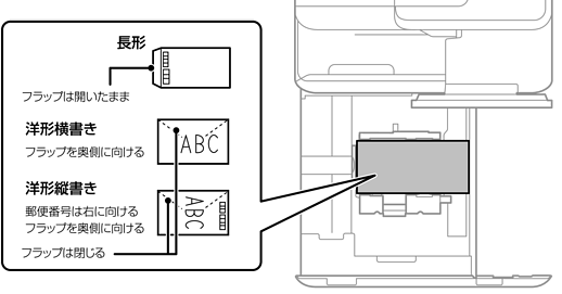 印刷する面を上にしてセットし、用紙ガイドを封筒に合わせてください。
