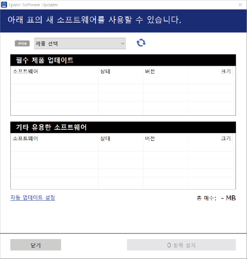 • Windows Server 운영 체제를 사용할 경우 Epson Software Updater를 사용할 수 없습니다. Epson 웹 사이트에서 최신 응용 프로그램을 다운로드 할 수 있습니다.