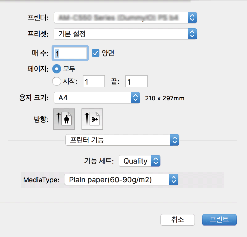 팝업 메뉴에서 프린터 기능을 선택합니다.