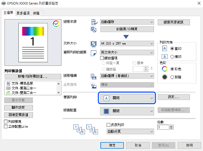 在印表機驅動程式畫面上顯示 [主選單] 索引標籤,然後從 [雙面列印] 選取 [關閉]。