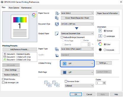 Printerin drayver ekranında Əsas tab-vərəqəsini göstərin və 2-tərəfli çap-dən Qeyri-aktiv seçin.