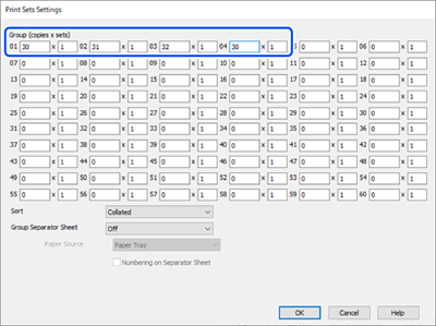 Məsələn, əgər siz məktəbdə dörd sinif (Sinif 1: 30 şagird, Sinif 2: 31 şagird, Sinif 3: 32 şagird, Sinif 4: 30 şagird) üçün materiallar çap etmək istəyirdinizsə, aşağıdakı parametrləri qura bilərsiniz.