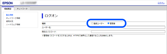 以下の説明は、管理者ロックと利用者制限の機能が有効なプリンターで、管理者が[登録ユーザーのWeb Configログオンを許可する]を選択している場合について説明しています。