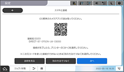 iOS11以降の標準カメラアプリを使ってください。iOS10以前の標準カメラアプリでは、プリンターの接続はできません。コード読み取り用のアプリを使っても、プリンターの接続はできません。接続できない場合は、[その他スマートデバイスとつなぐ]を選択してください。詳しくは「関連情報」をご覧ください。