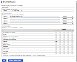 Se pretende enviar uma notificação para o endereço de correio eletrónico definido para número 1 em Definições do endereço de e-mail quando não existir papel na impressora, selecione a caixa de verificação da coluna 1 na linha Sem papel.