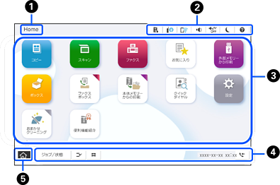 エラーや実行中のジョブ、割り込み中、未読ファクスなどの有無が表示されます。 |