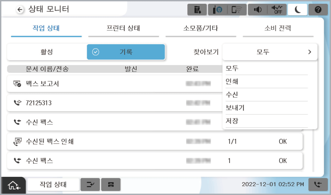 진행 중인 팩스 작업을 확인하거나 작업 기록을 확인할 수 있습니다.