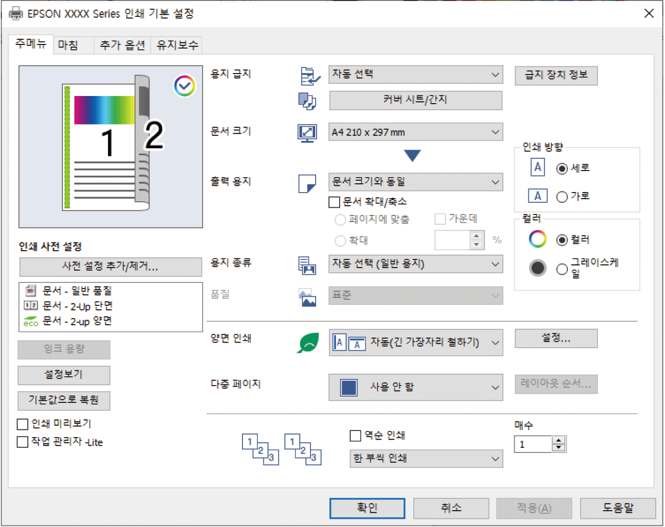 용지의 한 면에만 인쇄하려면 양면 인쇄를 사용 안 함으로 설정하십시오.