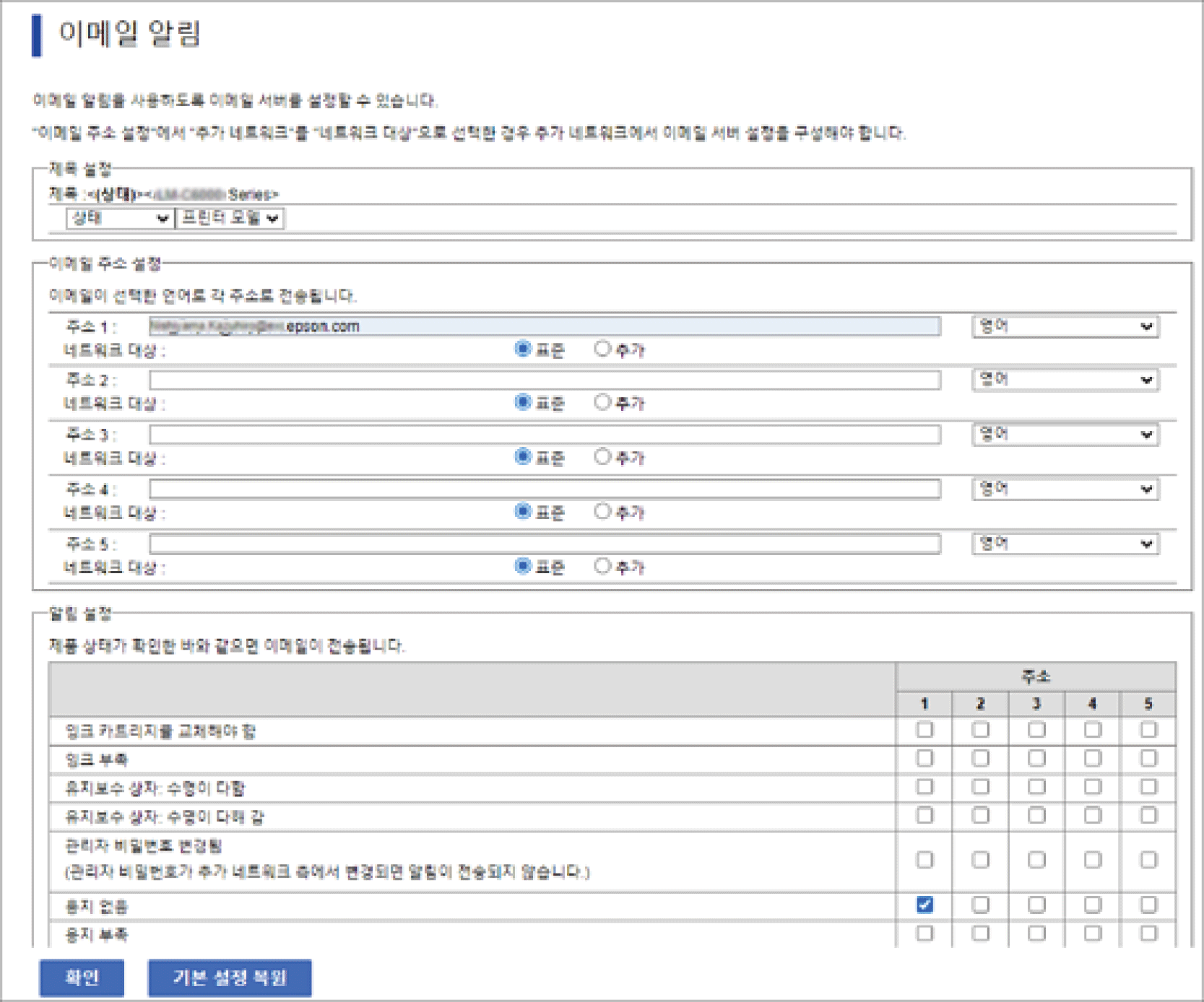 인쇄 중지 또는 프린터 오류와 같은 이벤트 발생 시 지정된 주소로 이메일이 전송되도록 이메일 알림을 구성할 수 있습니다. 최대 5 개의 수신처를 등록하고, 각 수신처에 대해 알림 설정을 지정할 수 있습니다.