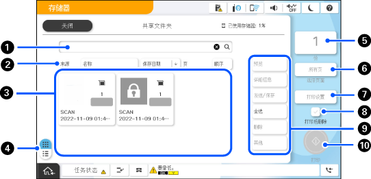 显示文件缩略图。设置了密码的文件上会显示一个钥匙图标。 表示文件是使用哪个功能保存的。