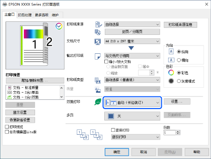 在打印机驱动程序屏幕上显示主窗口标签,从双面打印选择自动(长边装订)。