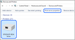 V razdelku Strojna oprema in zvok izberite Nadzorna plošča > Ogled naprav in tiskalnikov (Tiskalniki, Tiskalniki in faksi), kliknite ikono tiskalnika in nato še Natisni lastnosti strežnika v zgornjem delu okna.