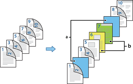Ločilni list (»a« na spodnji sliki). Papir, ki bo natisnjen z določitvijo strani in vira papirja (»b« na spodnji sliki).