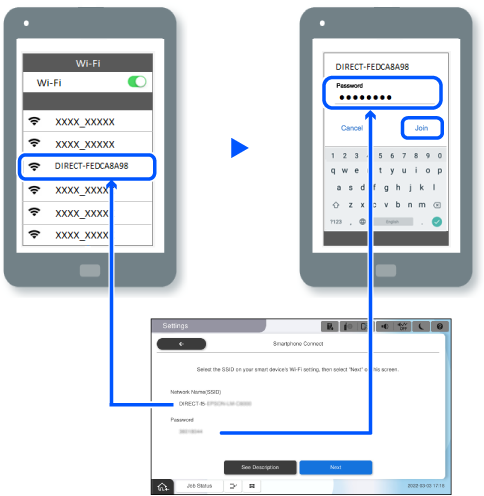 5 Kwenye skrini ya Wi-Fi ya kifaa maizi, teua SSID iliyoonyeshwa kwenye paneli dhibiti, na kisha uingize nenosiri.