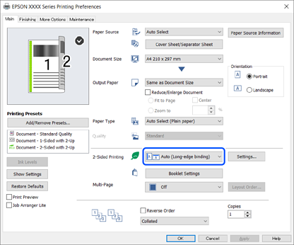 Avaa Yleiset-välilehti tulostinohjainnäkymässä ja valitse Kaksipuolinen tulostus-asetukseksi Automaattinen (pitkän reunan sidonta).