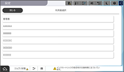 以下の説明は、パネルロックと利用者制限が有効なプリンターに、登録された利用者がログオンする場合の手順を例に説明しています。表示内容は機種や状況によって異なります。