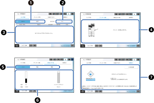 インク残量やメンテナンスボックス空き容量を表示します。 |