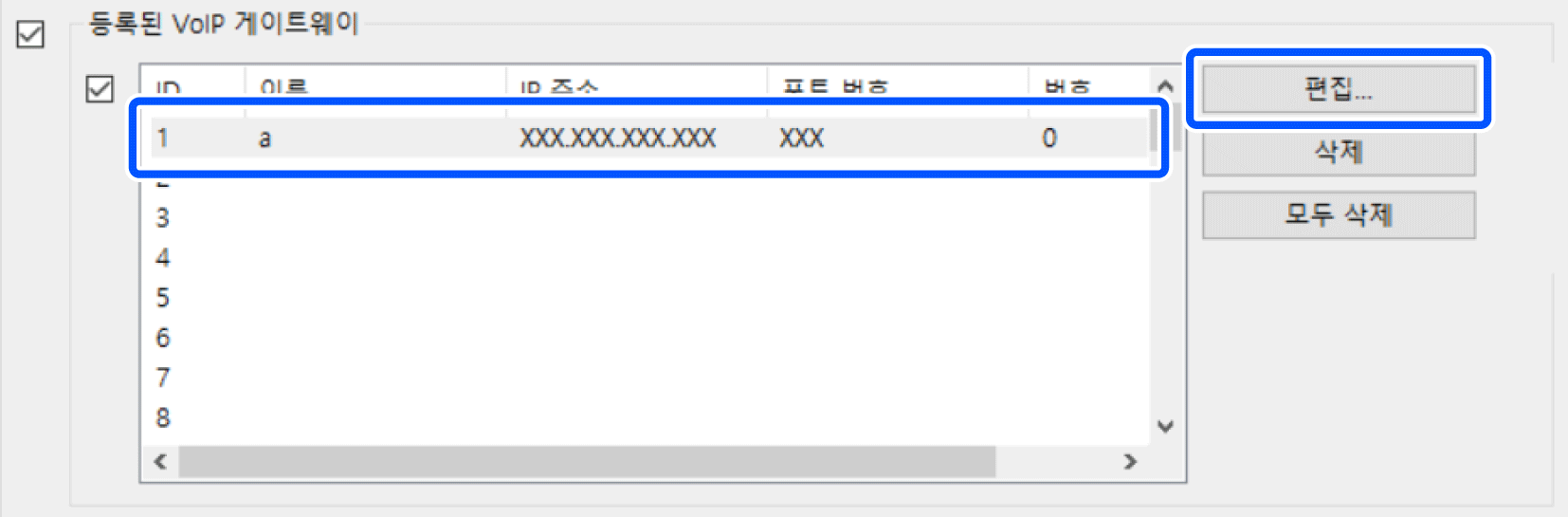 VoIP 게이트웨이 등록 정보를 변경하려면 등록된 VoIP 게이트웨이 목록에서 변경할 항목을 선택한 후 편집을 클릭하십시오.