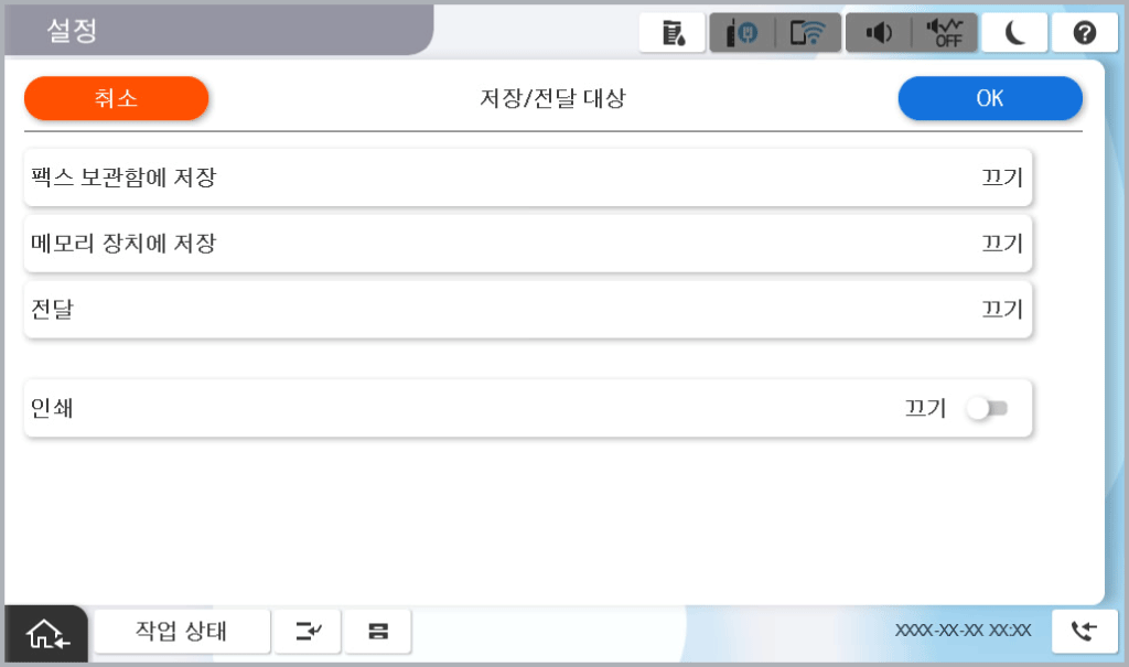 지정한 시간에 수신한 팩스를 저장하는 이 기능을 사용하기 전에, 프린터의 날짜/시간 및 시차 설정이 올바른지 확인해야 합니다. 설정 > 일반 설정 > 기본 설정 > 날짜/시간 설정에서 메뉴에 액세스합니다.