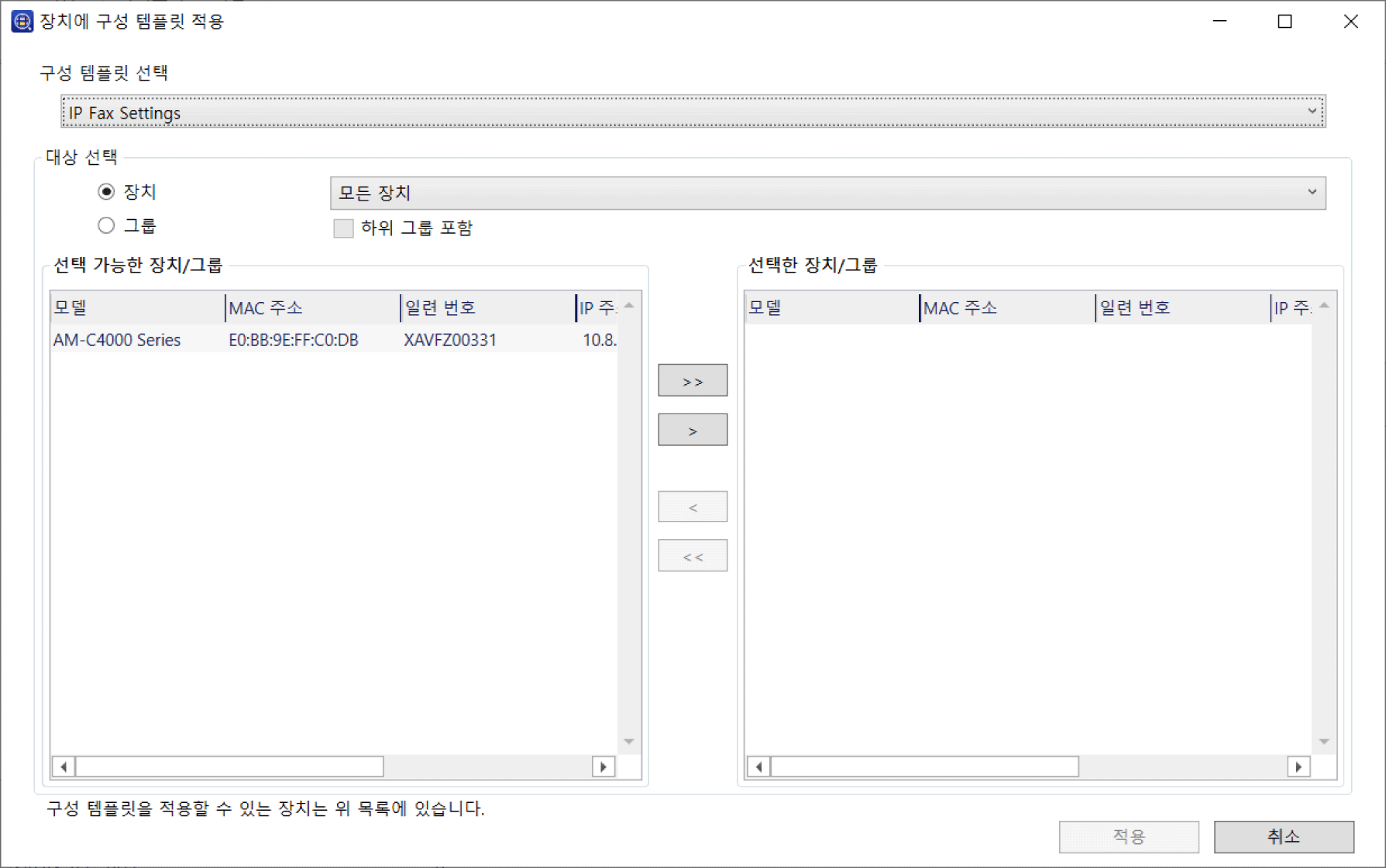 설정값을 적용할 프린터를 선택하고 구성 템플릿을 적용합니다.