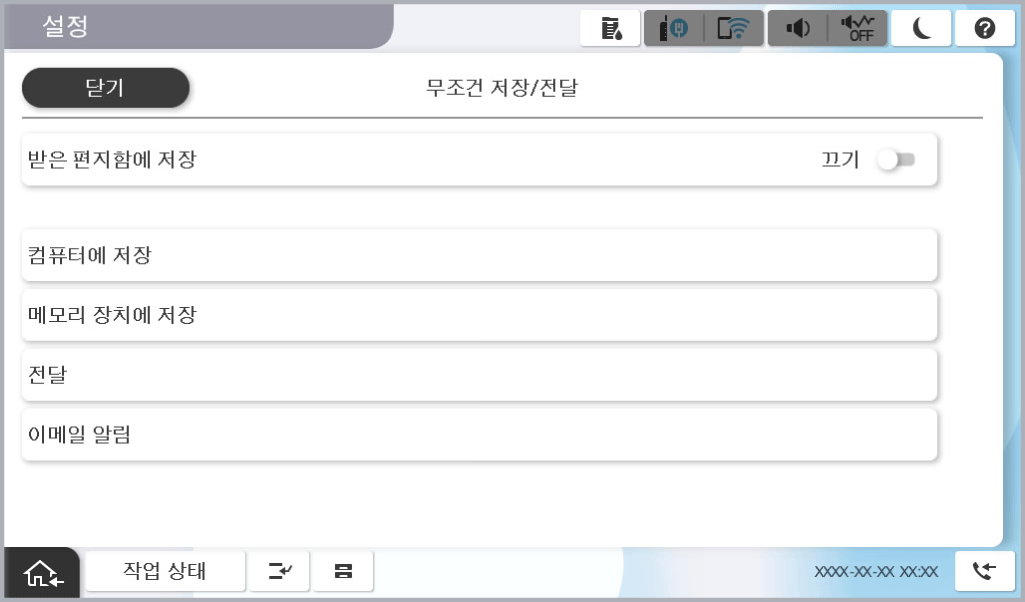 수신한 팩스에 대한 무조건 전달 설정은 여기까지 입니다. 필요에 따라 일반 설정을 지정할 수 있습니다. 자세한 내용을 보려면 저장/전달 설정 메뉴에서 일반 설정에 대한 설명을 참조하십시오.