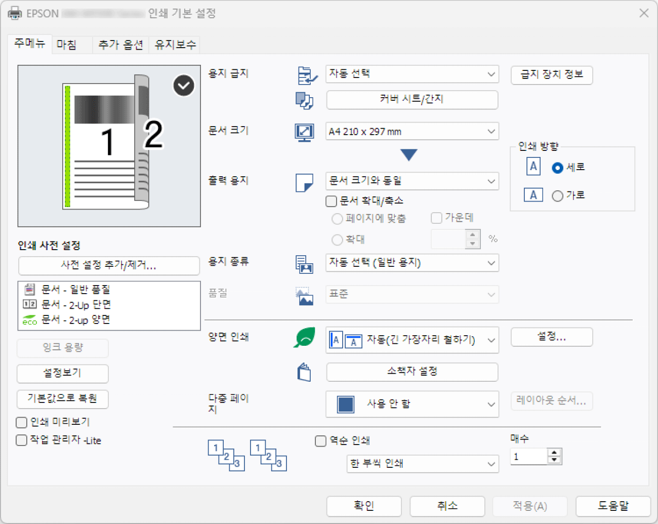• 용지의 한 면에만 인쇄하려면 양면 인쇄사용 안 함으로 설정하십시오.