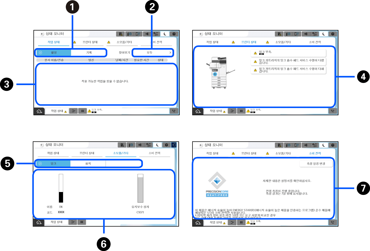 제어판에서 작업 상태를 선택하여 작업 상태 메뉴를 표시합니다. 프린터 또는 작업 상태를 확인할 수 있습니다.