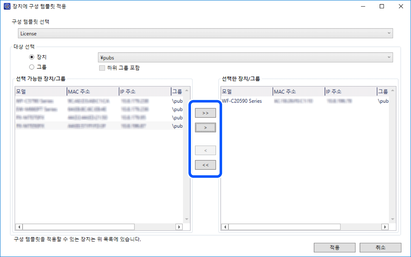 [>], [>>], [<], [<<]를 사용하여 템플릿을 적용하려는 장치 또는 그룹을 선택한 장치/그룹로 이동시킵니다.