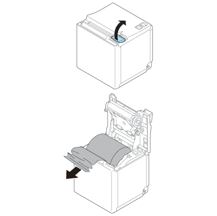 Tritt ein Papierstau auf, niemals das Papier mit Gewalt herausziehen. Öffnen Sie die Rollenpapierabdeckung, und beseitigen Sie den Papierstau.