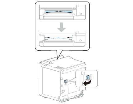 หากมีสิ่งแปลกปลอมเข้าสู่ใบมีดอัตโนมัติหรือม้วนกระดาษติด ใบมีดอัตโนมัติจะไม่สามารถกลับสู่ตำแหน่งที่ถูกต้องได้และจะล็อคอยู่กับที่ ในสถานการณ์นี้ ฝาครอบม้วนกระดาษจะไม่เปิดออกแม้ว่าคุณจะดึงคันโยกเปิดฝาครอบ