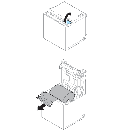 Als het papier vastloopt, moet u het papier nooit met kracht naar buiten trekken. Open de papierrolkap en verwijder het vastgelopen papier.