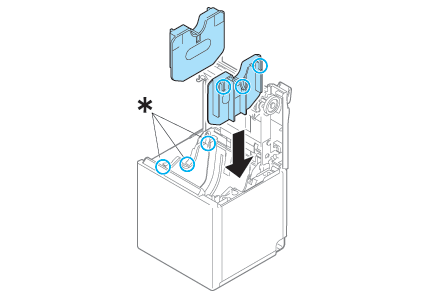 Poravnajte tri projekcije na vodilih za zvitek papirja s pravokotnimi luknjami (*) v tiskalniku in jih potem pritisnite navzdol.