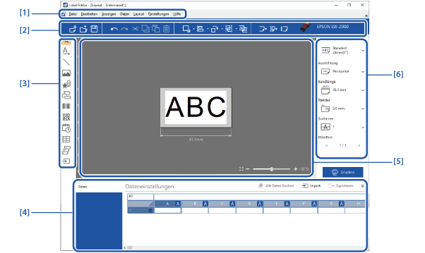 Der Bildschirm dieser Software besteht aus den folgenden sechs Bereichen.