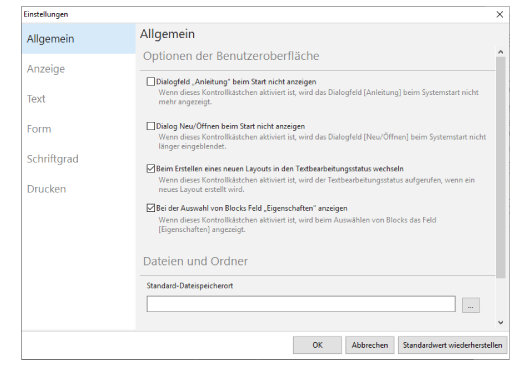 Mit den Benutzereinstellungen können Sie einige Fenster anzeigen oder ausblenden sowie die Standardeinstellungen für die Anzeige, die Schriftart, Formen und die Druckeinstellungen ändern.