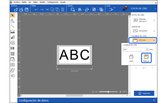 En el área de configuración de la cinta, haga clic en el ajuste de longitud de la cinta y seleccione Manual.
