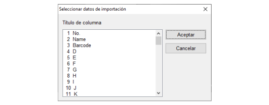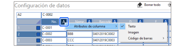 Al importarse un archivo, el atributo de todas las columnas se ajustará a Texto. Hay que cambiar el atributo de las columnas que contienen códigos de barras o datos de códigos QR, o imágenes (nombres de ruta completos de los archivos de imagen).