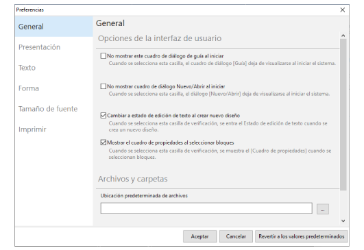 La configuración de preferencias permite mostrar u ocultar algunas ventanas y cambiar ajustes predeterminados de visualización, fuente, formas y configuración de impresión.