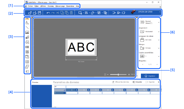 Fenêtre de création de données Vous pouvez entrer et éditer le contenu d'étiquettes à insérer dans la Fenêtre de modification de la mise en page. Si cette fenêtre est masquée, cliquez sur |