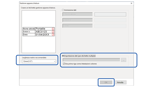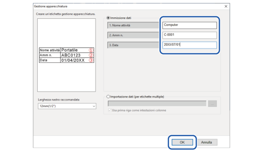 Nota:Quando si creano più etichette, lasciare vuoti i campi di immissione e fare clic su OK. È possibile inserire facilmente i dati nella Finestra creazione dati. |