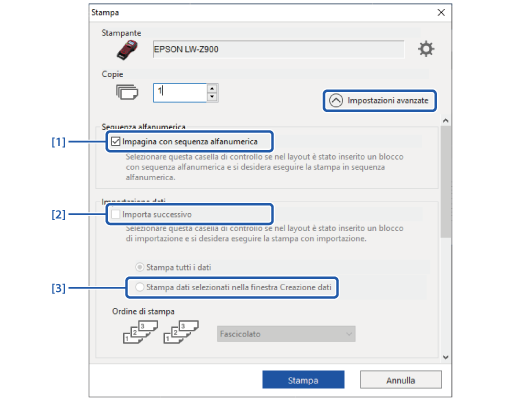 Selezionare questa casella di controllo per stampare più etichette create utilizzando la Finestra creazione dati. |