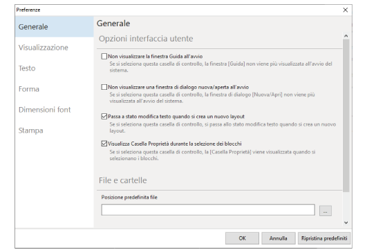 Le impostazioni delle preferenze consentono di visualizzare o nascondere alcune finestre e di modificare le impostazioni predefinite di visualizzazione, carattere, forme e impostazioni di stampa.