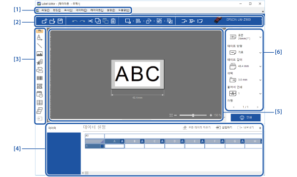 데이터 작성 창 레이아웃 편집 창에 들어갈 라벨의 내용을 입력 및 편집할 수 있습니다. 이 창이 숨겨져 있는 경우에는 화면의 우측 하단에 있는 |