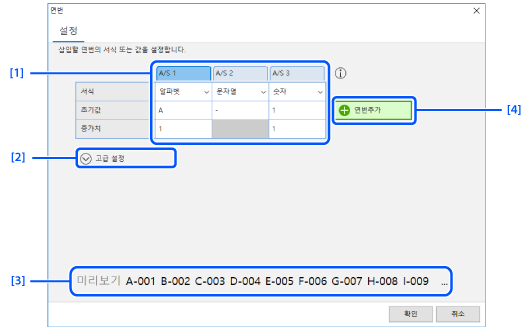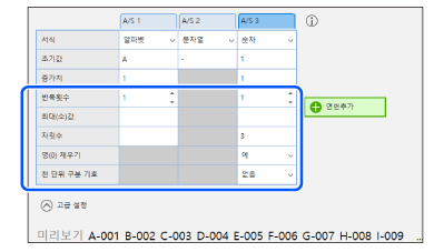 클릭하면 고급 설정을 지정할 수 있습니다. 예제 라벨을 만들려면 다음과 같이 A/S 3 열의 설정을 변경하십시오.