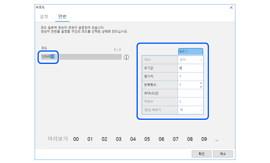 연번 창에서 일련번호화할 코드의 범위를 지정하고, 시작 값과 기타 설정을 지정합니다.