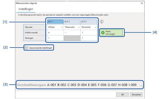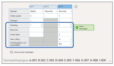 Met deze functie kunt u een reeks labels met oplopende nummers of alfanumerieke codes maken. Door alleen de beginwaarde en het aantal exemplaren op te geven, kunt u zo eenvoudig een hele reeks geserialiseerde labels afdrukken.