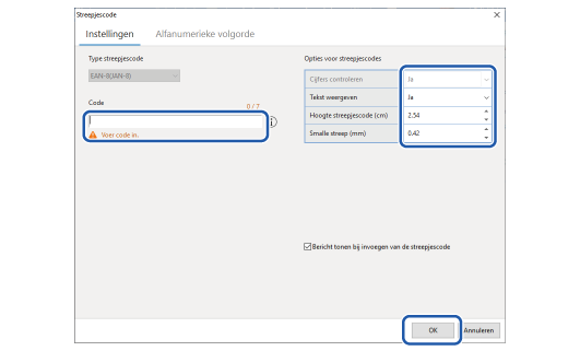 Boven > Verschillende soorten labels maken > Een streepjescode of QR-code toevoegen