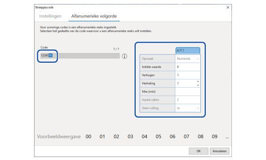 Geef in het venster Alfanumerieke volgorde het bereik in de code op dat u wilt serialiseren, en stel voor dat bereik de gewenste beginwaarde en andere instellingen in.