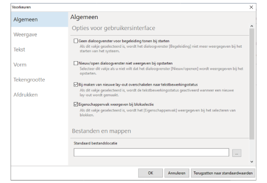 In de voorkeursinstellingen kunt u bepaalde vensters weergeven of verbergen en standaardinstellingen voor weergave, lettertypen, vormen en afdrukken wijzigen.