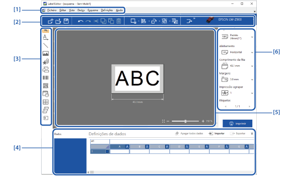 Janela Criação de dados Pode introduzir e editar o conteúdo das etiquetas que pretende inserir na Janela Edição de esquema. Se esta janela estiver oculta, faça clique em |